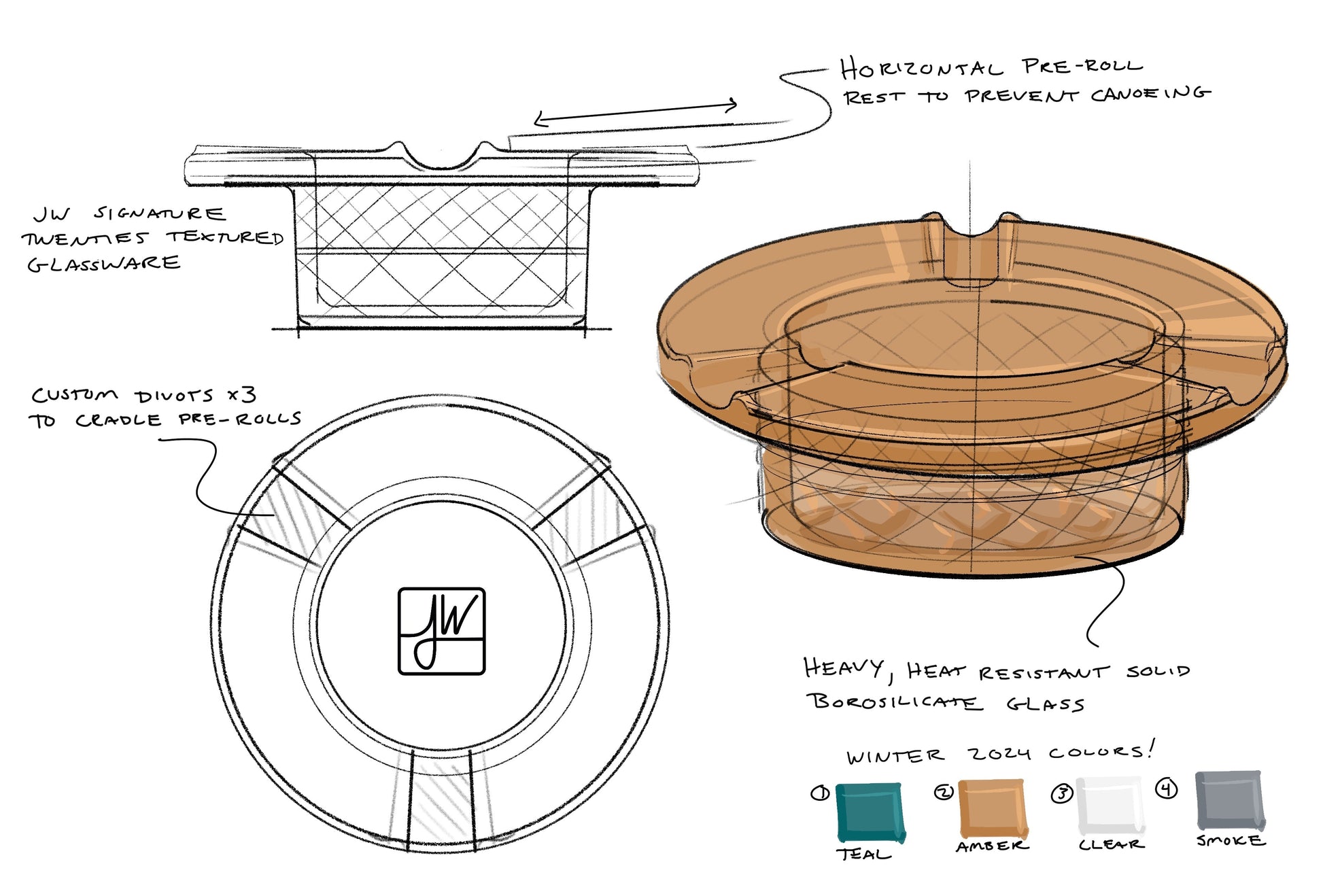 Three custom divots cradle a pre-roll perfectly with a wide, horizontal rim ensuring your joint burns evenly and doesn't canoe.